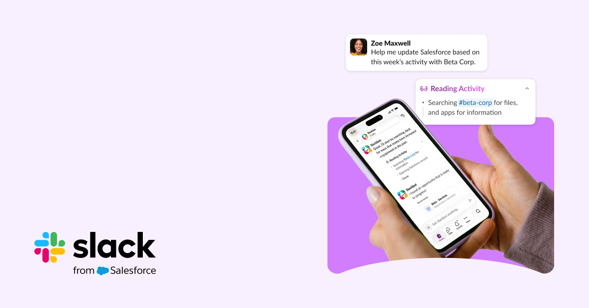 Slackbot knows your channels, conversations, and customers, and can take instant action based on your prompts. Spin up a new account, log notes from a recent call, and update your records, all in Slack — all you have to do is ask.